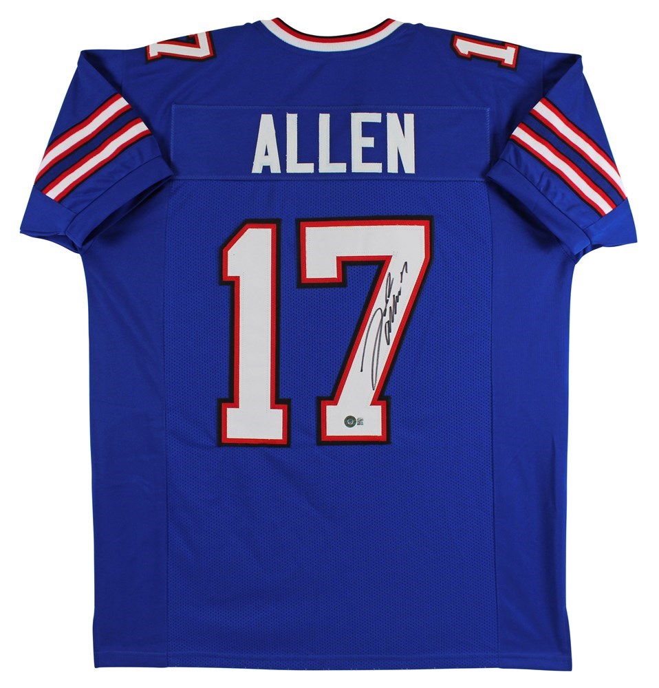 This Autographed Blue Pro Style Jersey has been Personally Signed by Josh Allen of the Buffalo Bills. This item is 100% Authentic to include a hologram by Beckett Authentication Services. This item may come with the new Beckett Authentication hologram that has a scannable QR code rather than the traditional COA. If you would like to have a COA, you are welcome to reach out to Beckett for a printed certification once you receive your item. This is a BAS Witnessed Protection Program item which means a Beckett Authentication Service representative was present when this item was being signed. This is a stock item. We conducted an autograph signing with Josh Allen and we have several of these available. The one you will receive will be of equal quality to the one pictured. This item can be verified through BAS Witnessed. This is a X-Large sized, non-branded, custom-stitched Jersey.